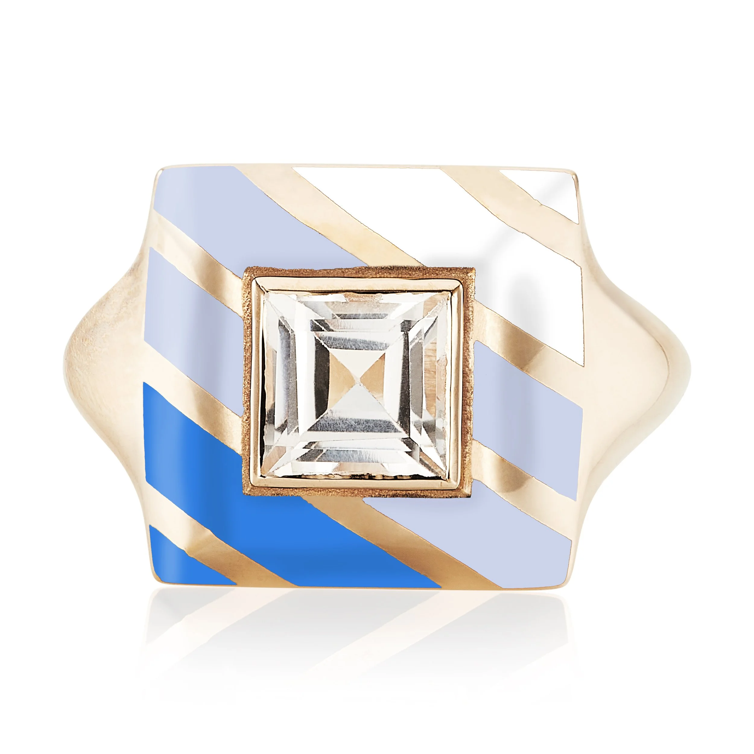Handmade in the UK, the Candy Lacquer collection is inspired by the traditional techniques of Japanese lacquer work, and their striking simplicity and blocks of colour, fused with Alice’s inspiration from Ettore Sottsass’s Memphis movement. Set here with a crisp white topaz, the Candy Lacquer signet ring can be made to order with a stone of the client’s choice and made-to-measure colour selection for the lacquer enamel.