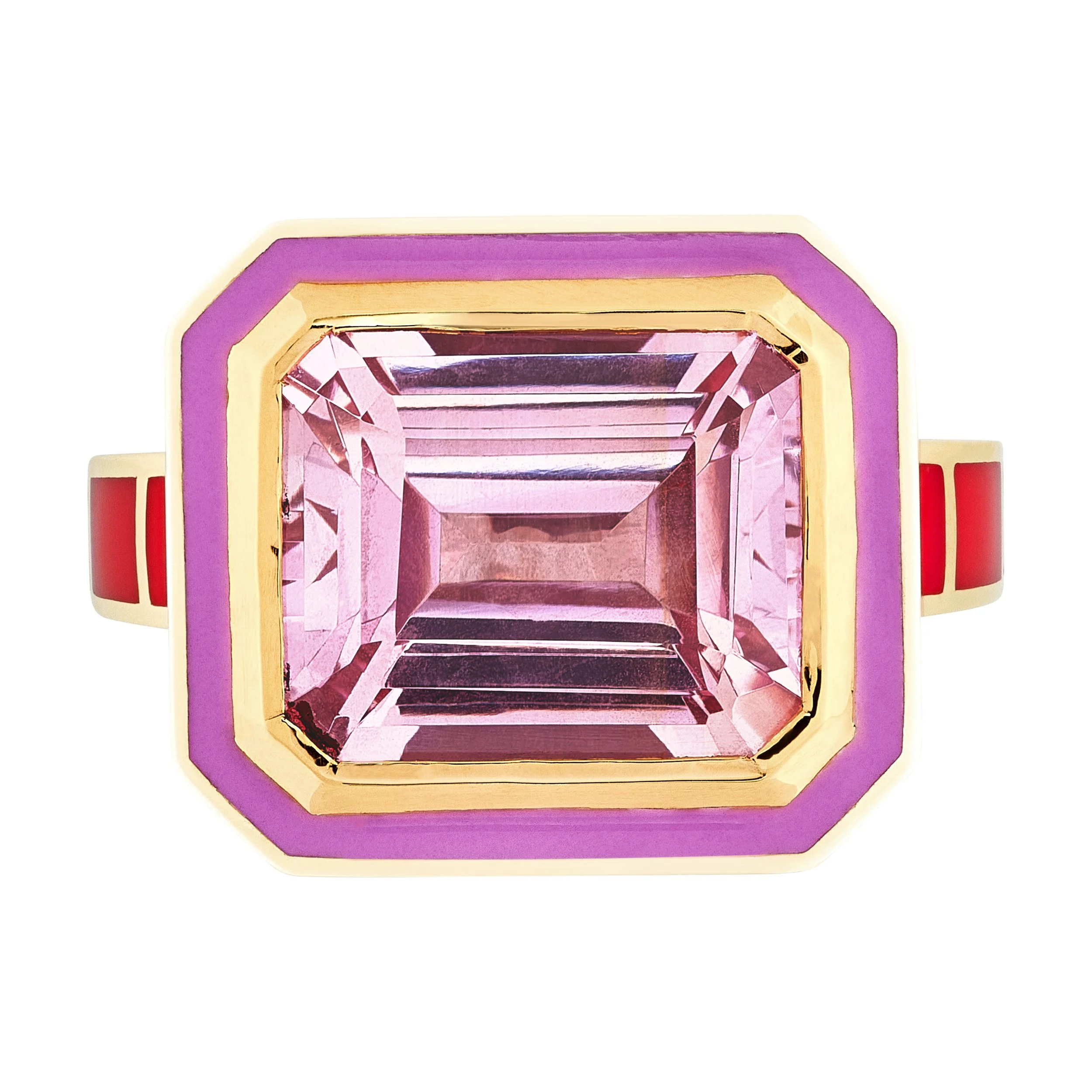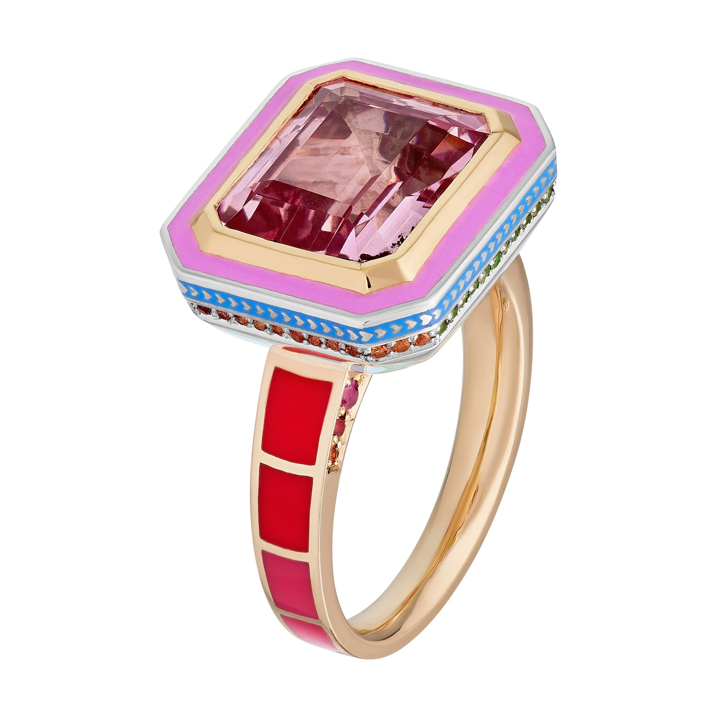 14ct yellow gold band, sterling silver decorated with lacquer enamel, 22ct gold bezel setting, emerald cut pink sapphire, pave- pink sapphire , orange sapphire, ruby, dark blue sapphires, orange sapphires, tsavorites.